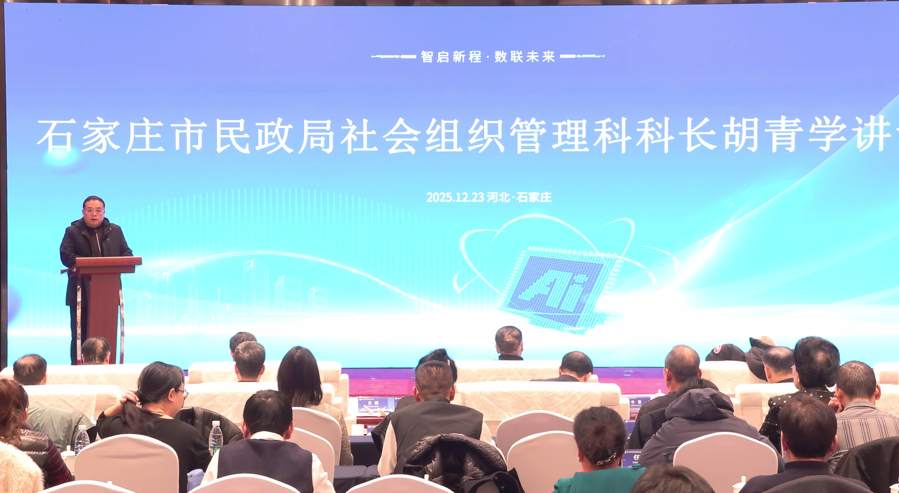 石家庄市民政局胡清学科长在讲话中肯定了石家庄市安防协会的办会宗旨,他指出,安防行业正面临数字化、智能化转型的关键时期,希望石家庄市安防协会继续坚持党建引领、依法立会、服务增效,为平安城市建设贡献更大力量。