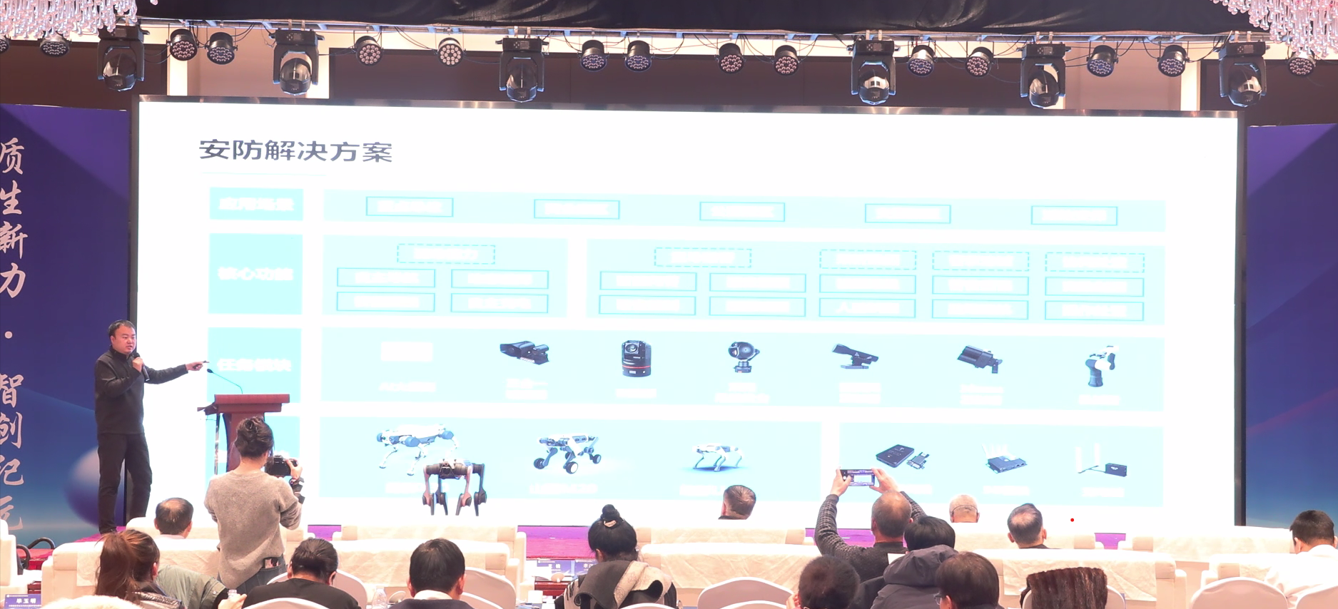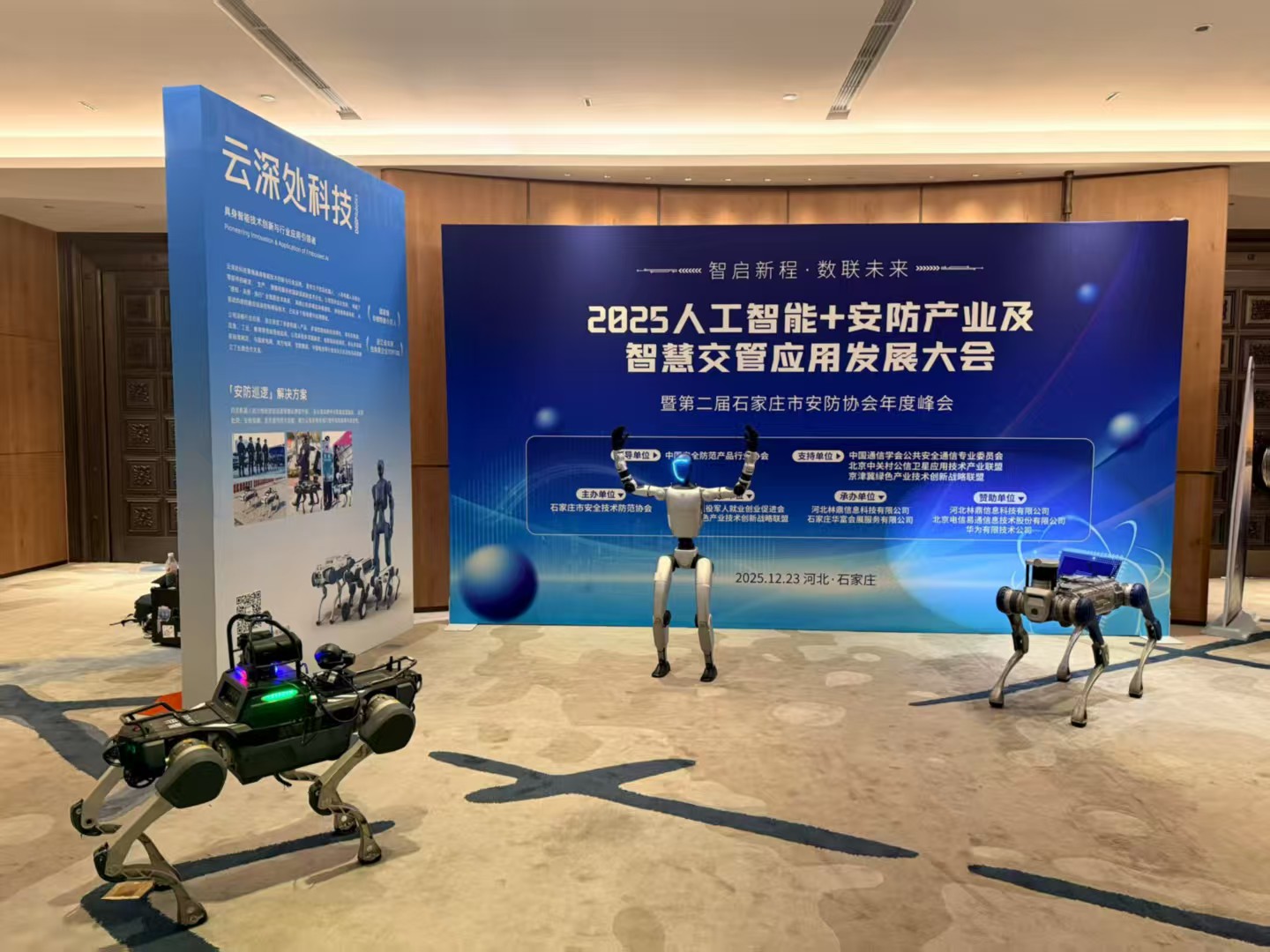 同时,常务理事单位浙江大华技术股份有限公司、理事单位新华三技术有限公司、副会长单位河北鑫汇隆城投建设工程有限公司、副会长单位北京电信易通信息技术股份有限公司、副会长单位河北阳腾电子科技有限公司、会长单位河北林鼎信息科技有限公司、华为技术有限公司、杭州云深处科技股份有限公司等进行了产品展示和介绍,让观众感受到了一场关于“科技如何赋能公共安全、让社会更智能、更安全”的沉浸式盛宴。宇树和云深处的机器人、机器狗现场展示奔跑、跳跃、摔倒后自恢复等敏捷动作,科技感十足,参观代表不仅看到了酷炫的产品,更理解了这些技术如何深度融合,改变未来的工作模式。