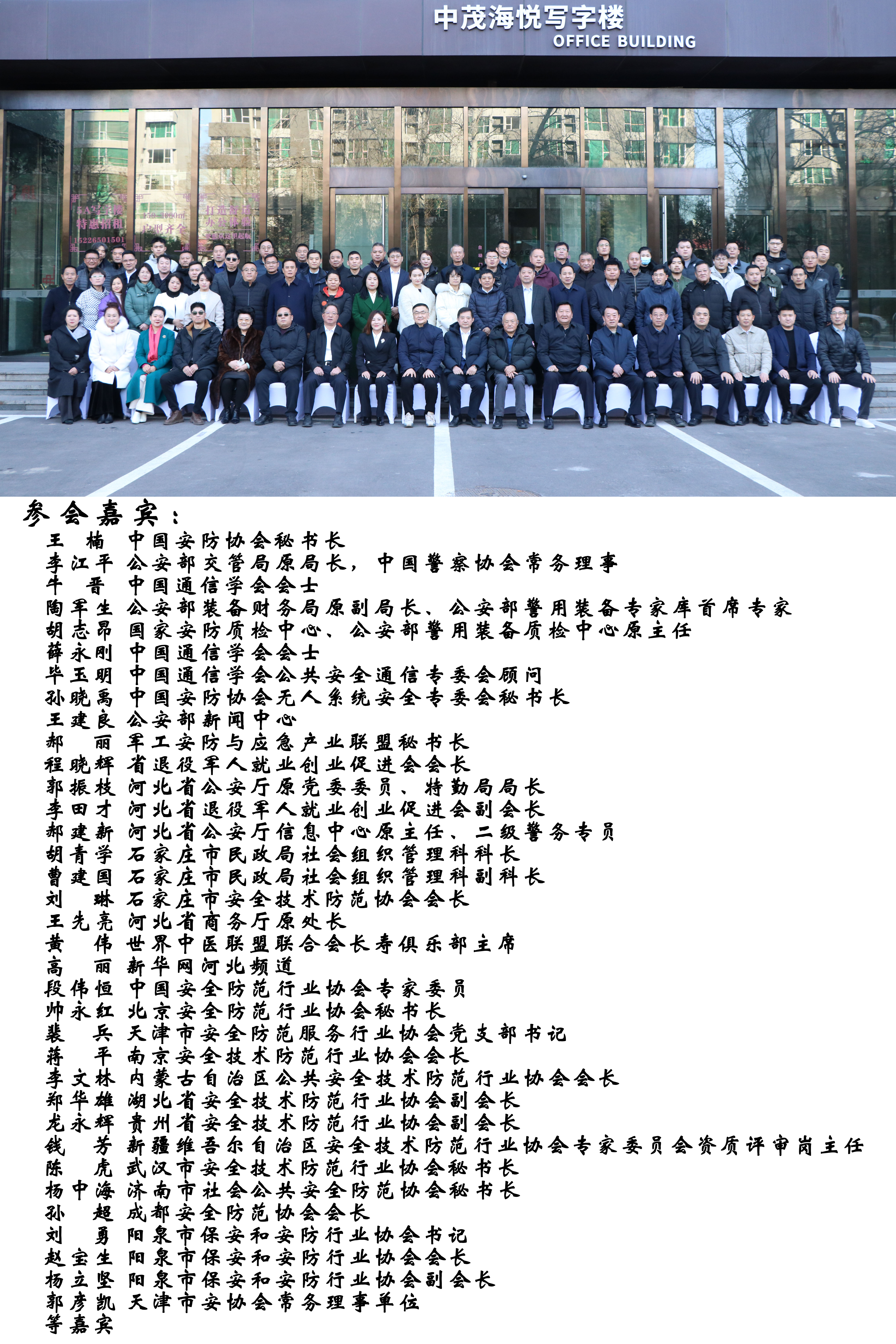中国安全防范产品行业协会秘书长王楠、公安部交管局原局长李江平、中国通信学会会士牛晋、公安部装备财务局原副局长、公安部警用装备专家库首席专家陶军生、国家安防质检中心、公安部警用装备质检中心原主任胡志昂、河北省公安厅原党委委员、特勤局局长郭振枝、河北省退役军人就业创业促进会会长程晓辉、河北省退役军人就业创业促进会副会长李田才、石家庄市民政局社会组织管理科科长胡青学等领导、专家出席活动,河北省公安厅、石家庄市公安局、民政局等相关主管部门领导以亲临或电话祝贺形式表达了对会议的关注和祝贺。